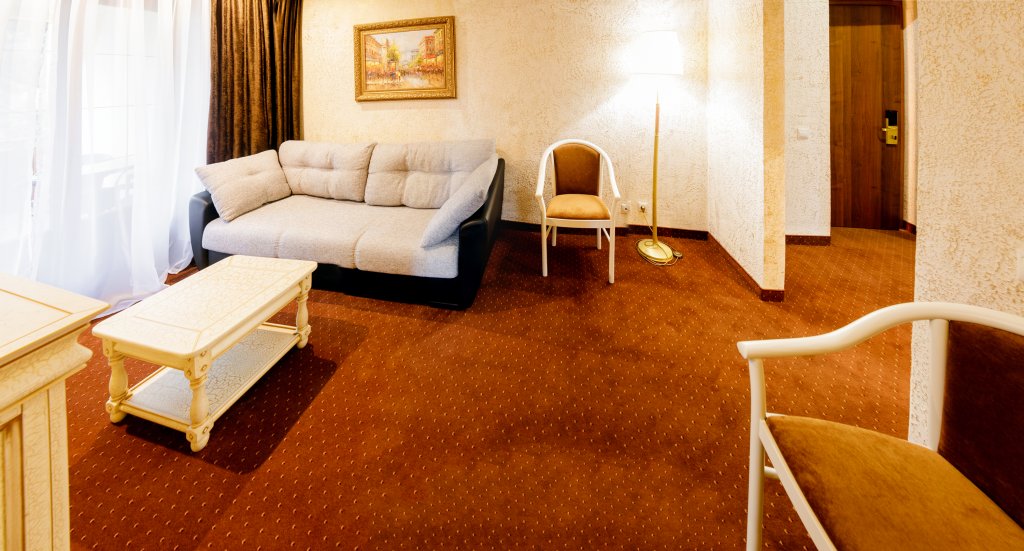 Площадь номера - 58 кв.м. 2 осн. места. 4 доп. места. Балкон. Мебель: вешалка, диван, зеркало, кровать двуспальная, прикроватные тумбочки, стол, стулья, шкаф. Мини-кухня. Оборудование: кондиционер, мини-холодильник, набор посуды, плита электрическая, сейф, телевизор, телефон, электрочайник. Санузел: с душем, туалетные принадлежности, фен. Сервис: Wi-Fi бесплатно, room-сервис (24 часа), мини-бар (платно), смена полотенец (по необходимости), смена постельного белья (1 раз в 3 дня), уборка номера (ежедневно), услуги внутренней телефонной связи.